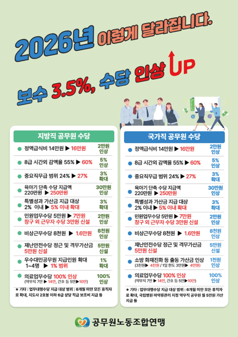 2026년 보수 3.5%, 수당 인상 UP! 작성자 정보 동공노관리자 작성 작성일 2026.01.12 09:25 컨텐츠 정보 31 조회 목록 본문 2026년 보수 3.5%, 수당 인상 UP! 관련자료 이전 2025년 공무원노조-행정안전부 정책협의체 운영결과 보고회의 작성일 2026.01.12 09:51 다음 제4대 노조위원장 당선공고 작성일 2025.12.24 13:52 댓글 0 등록된 댓글이 없습니다. 로그인한 회원만 댓글 등록이 가능합니다. 목록