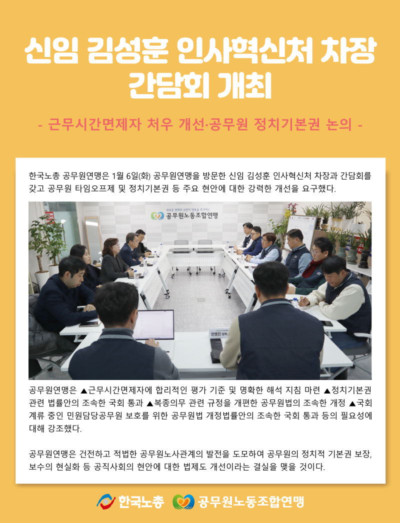 신임 김성훈 인사혁신처 차장 간담회 개최 작성자 정보 동공노관리자 작성 작성일 2026.01.12 17:59 컨텐츠 정보 30 조회 목록 본문 신임 김성훈 인사혁신처 차장 간담회 개최 관련자료 이전 전국경찰직장협의회와 간담회 개최 작성일 2026.01.12 18:01 다음 조합원과 함께한 공무원연맹의 2025년 작성일 2026.01.12 09:52 댓글 0 등록된 댓글이 없습니다. 로그인한 회원만 댓글 등록이 가능합니다. 목록