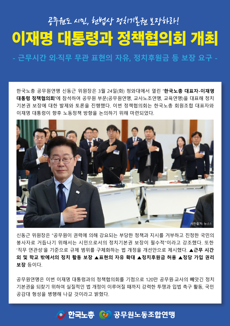 이재명 대통령과 정책협의회 개최 작성자 정보 동공노관리자 작성 작성일 2026.03.24 16:35 컨텐츠 정보 115 조회 목록 본문 이재명 대통령과 정책협의회 개최 관련자료 이전 현장 공무원을 위한 더 빠르고 강력한 승진·보상 작성일 2026.03.31 17:19 다음 5월1일 노동절 법정 공휴일로 지정 작성일 2026.03.24 16:35 댓글 0 등록된 댓글이 없습니다. 로그인한 회원만 댓글 등록이 가능합니다. 목록