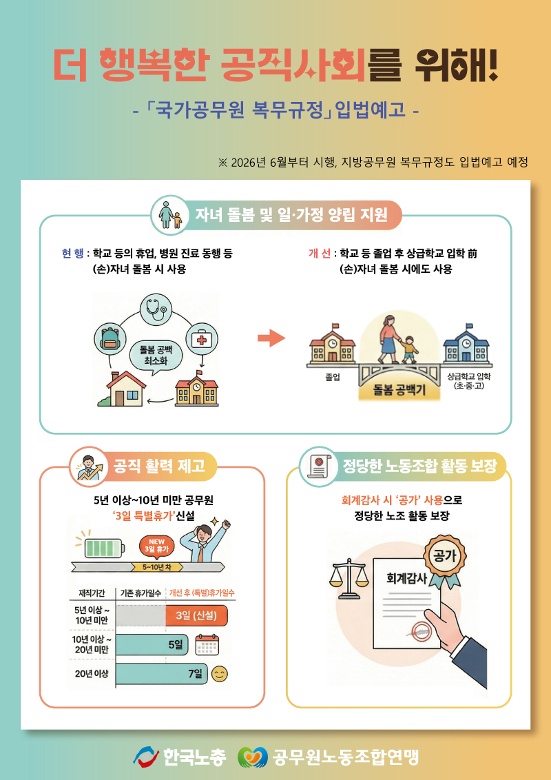 더 행복한 공직사회를 위해! 국가공무원 복무규정 입법예고 작성자 정보 동공노관리자 작성 작성일 2026.04.07 18:12 컨텐츠 정보 88 조회 목록 본문 더 행복한 공직사회를 위해! 국가공무원 복무규정 입법예고 관련자료 이전 2026년 단체협약 아이디어 공모전 선호도 조사 작성일 2026.04.13 17:04 다음 시간선택제 공무원, 주당 근무시간 당사자가 신청해야 변경가능 작성일 2026.04.01 13:39 댓글 0 등록된 댓글이 없습니다. 로그인한 회원만 댓글 등록이 가능합니다. 목록