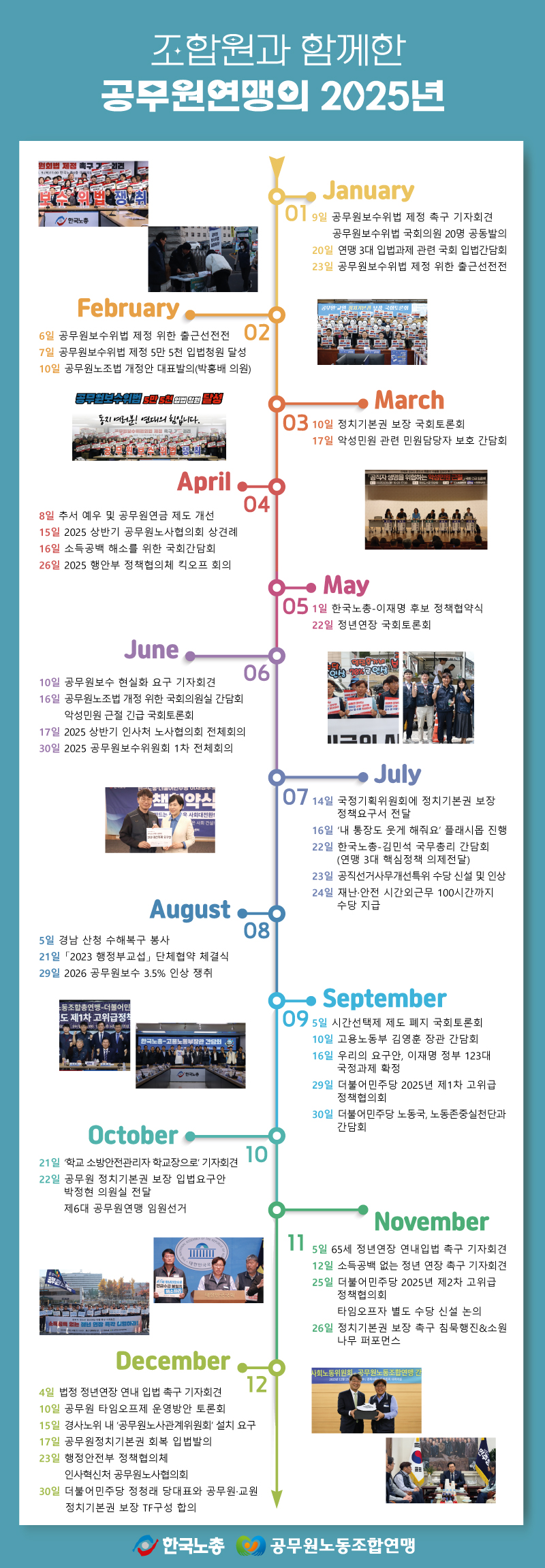 조합원과 함께한 공무원연맹의 2025년 작성자 정보 동공노관리자 작성 작성일 2026.01.12 09:52 컨텐츠 정보 32 조회 목록 본문 조합원과 함께한 공무원연맹의 2025년 관련자료 이전 신임 김성훈 인사혁신처 차장 간담회 개최 작성일 2026.01.12 17:59 다음 2025년 공무원노조-행정안전부 정책협의체 운영결과 보고회의 작성일 2026.01.12 09:51 댓글 0 등록된 댓글이 없습니다. 로그인한 회원만 댓글 등록이 가능합니다. 목록