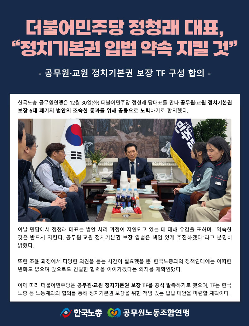 더불어민주당 정청래 대표, “정치기본권 입법 약속 지킬 것” 작성자 정보 동공노관리자 작성 작성일 2026.01.12 18:05 컨텐츠 정보 33 조회 목록 본문 더불어민주당 정청래 대표, “정치기본권 입법 약속 지킬 것” 관련자료 이전 폐지사업 알림(베스트 동료등 선정 및 생일축하금 관련 사업) 작성일 2026.01.15 17:17 다음 전국경찰직장협의회와 간담회 개최 작성일 2026.01.12 18:01 댓글 0 등록된 댓글이 없습니다. 로그인한 회원만 댓글 등록이 가능합니다. 목록